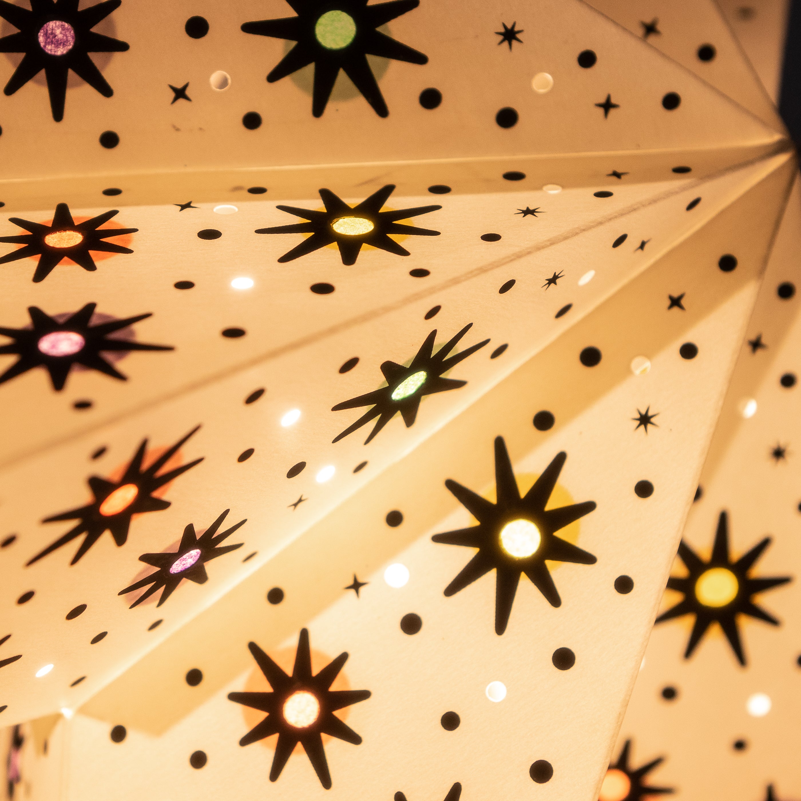 Add instant joy to any space with our vibrant Spirit: Sherbet Fizz paper star lantern. Featuring a crisp white base, contrasting black screen printed details, and delicate rainbow tissue inserts, this lantern creates a bold, contemporary look that shines bright day or night.
