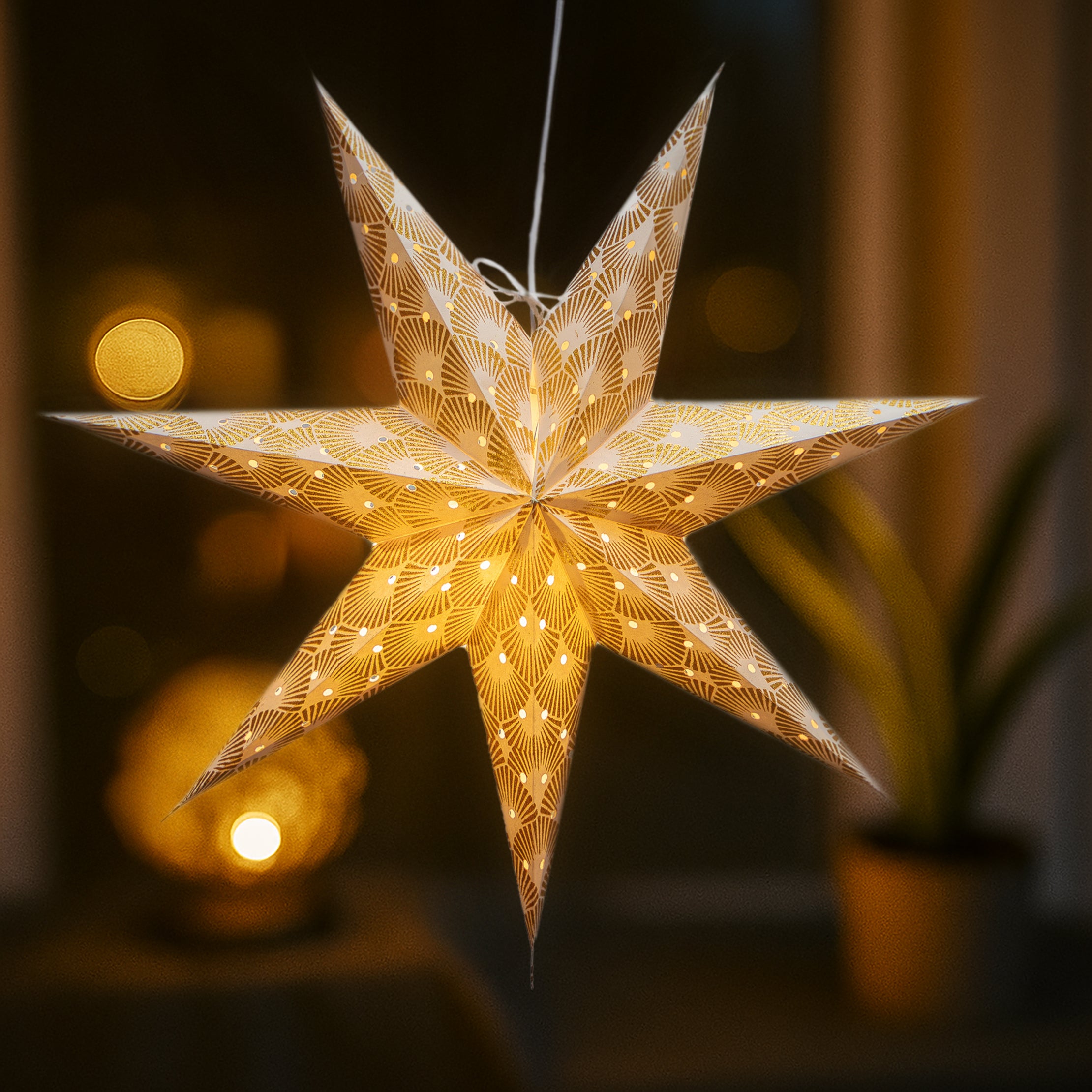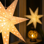 Bring a warm, starlit glow to your home with this elegant set of three handmade paper lanterns. Featuring two Deco Gold stars (60cm) and one striking North Star White (87cm), this bundle creates a stunning layered display of light and shadow.