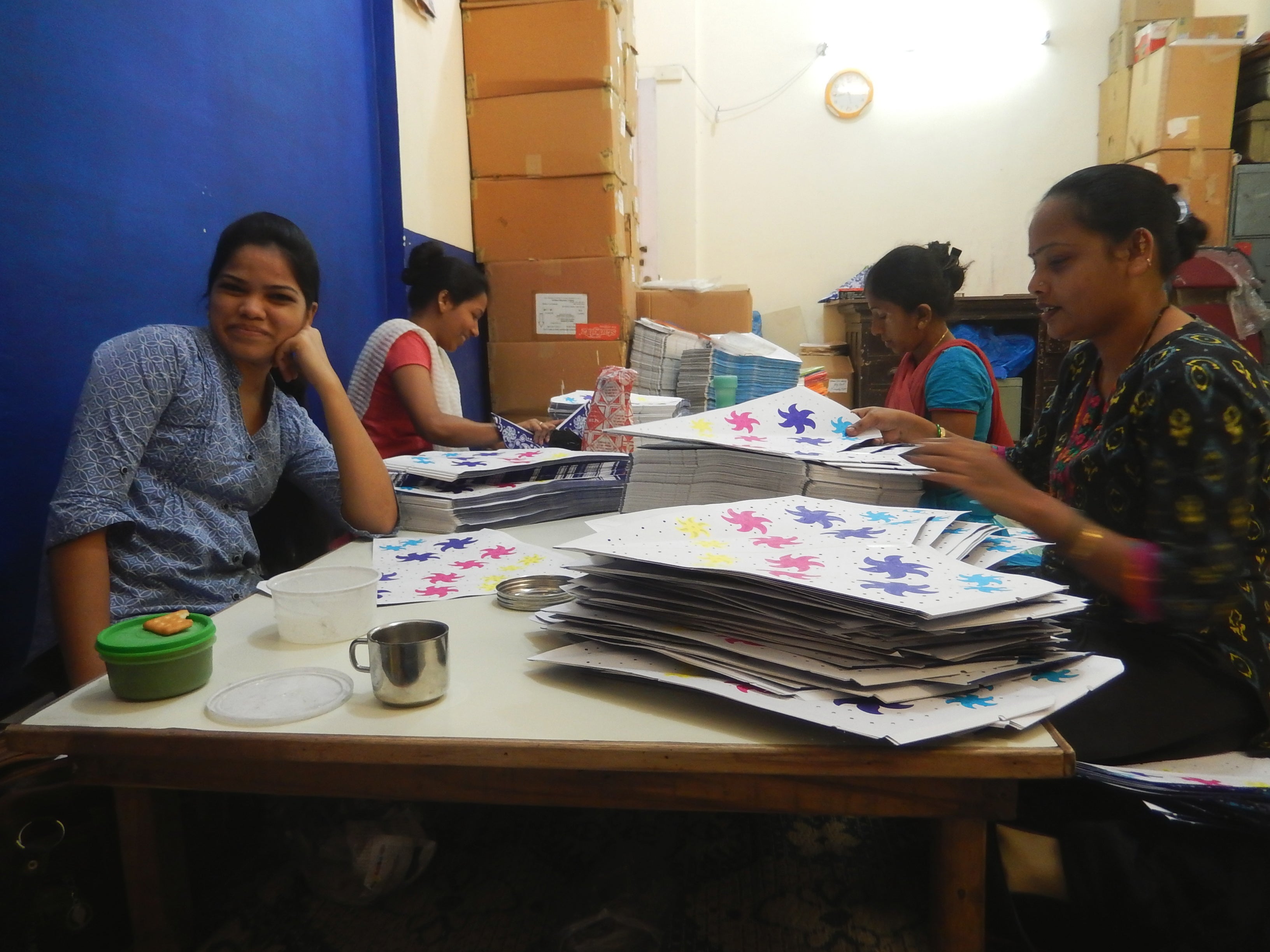 Paper Starlights are handmade by a small core of artisans and printers based in safe and congenial premises. Homeworkers – members of the family housing colony – chip in during busy periods. The majority of the workers are women, and work patterns are flexible, enabling work to be arranged around family life.