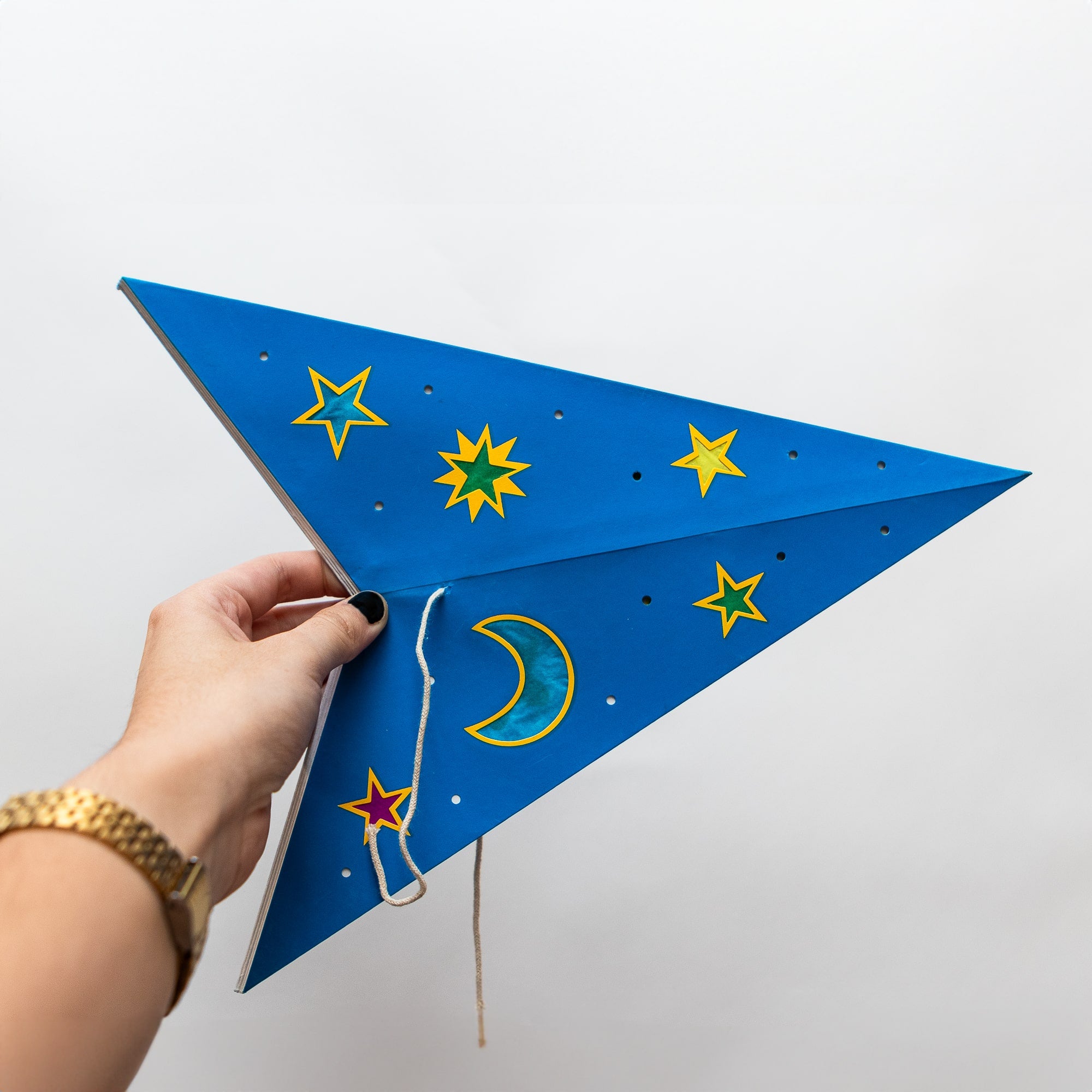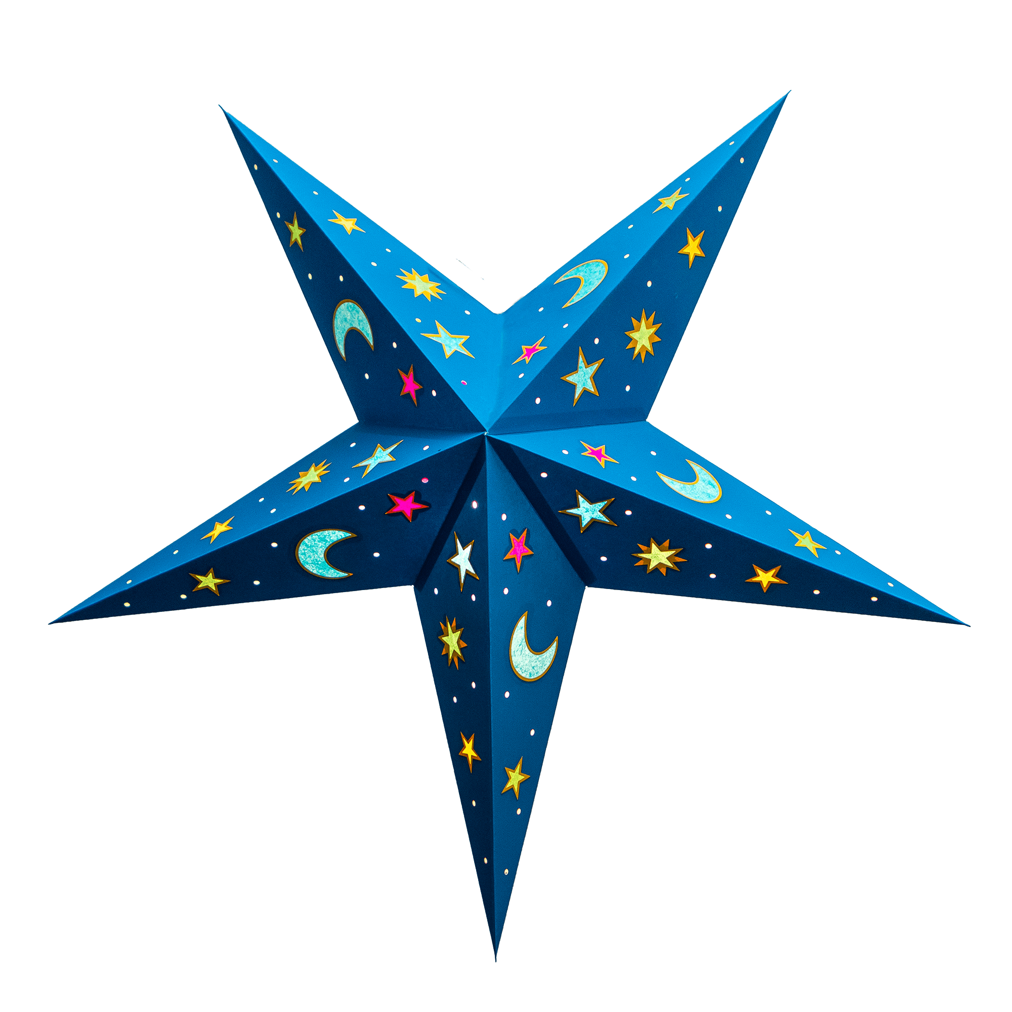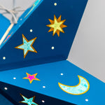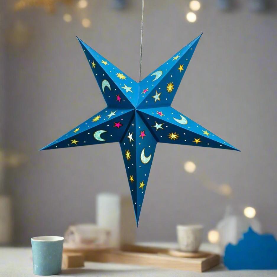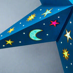 Bring the beauty of a starry night indoors with our Sea Blue Moon & Stars lantern. Against a rich sea-blue backdrop, multicoloured moons and stars glow softly, creating a celestial light show that adds warmth, wonder, and charm to any space.