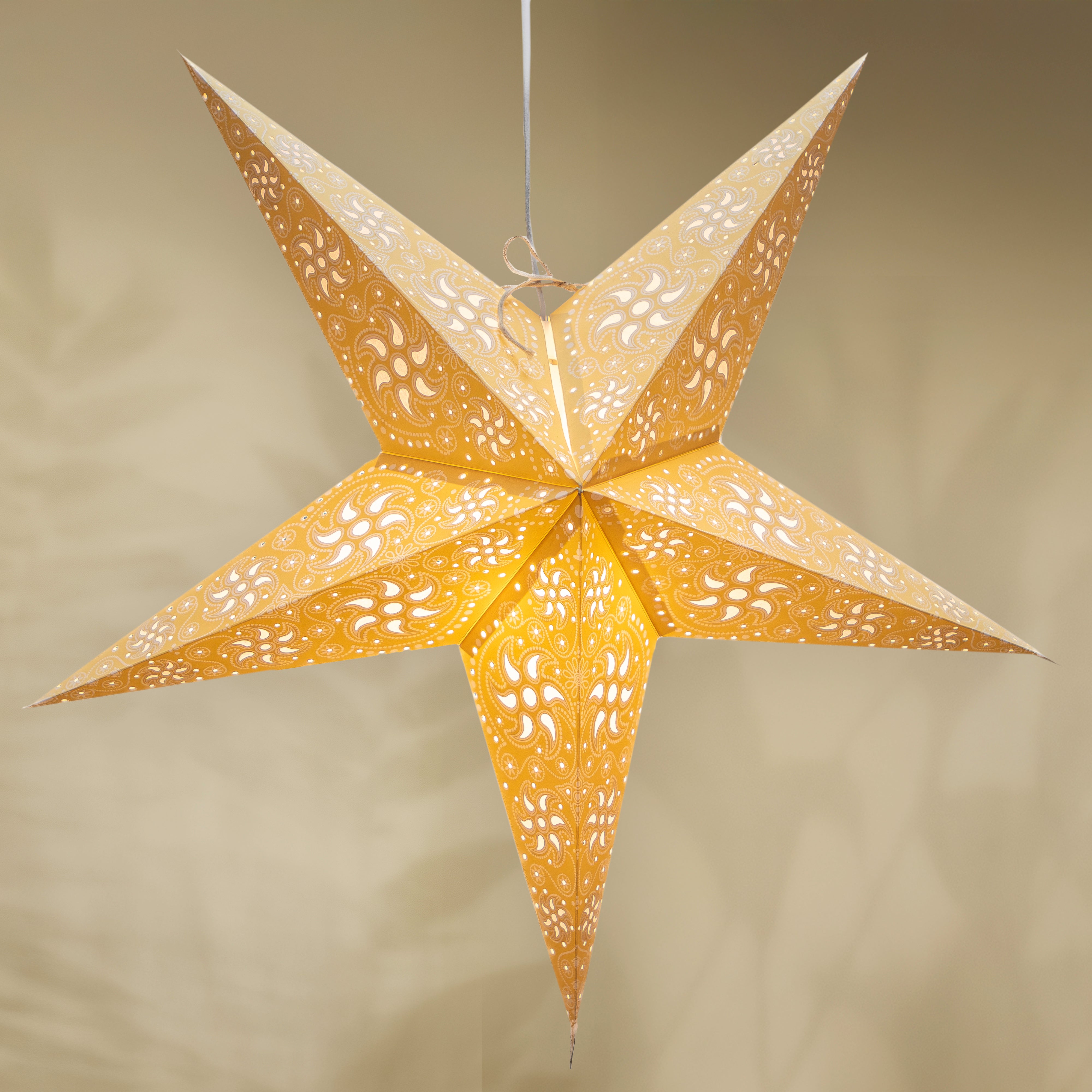 Light up your space with the timeless elegance of our Firework Sandstone star lantern. Handcrafted from cream-coloured paper, this 60cm five-pointed star features a delicate paisley-inspired pattern, creating a mesmerising display of light and shadow when illuminated.