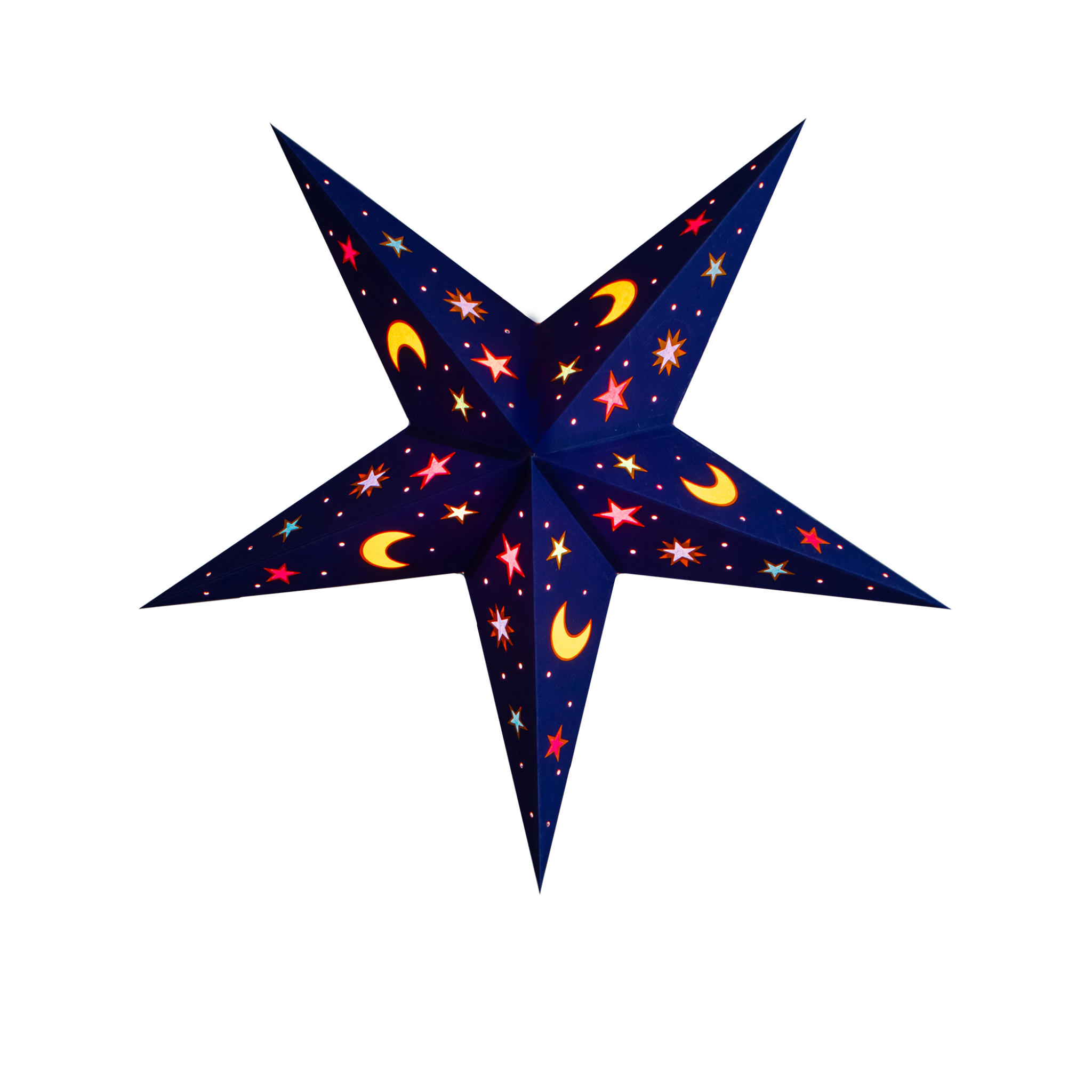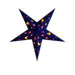 Bring the magic of a clear night sky into your home with this spellbinding blue star lantern. Multicoloured moons and stars glow against a deep midnight blue base, while tiny hand punched perforations scatter light like stardust; creating a captivating twinkle when illuminated.