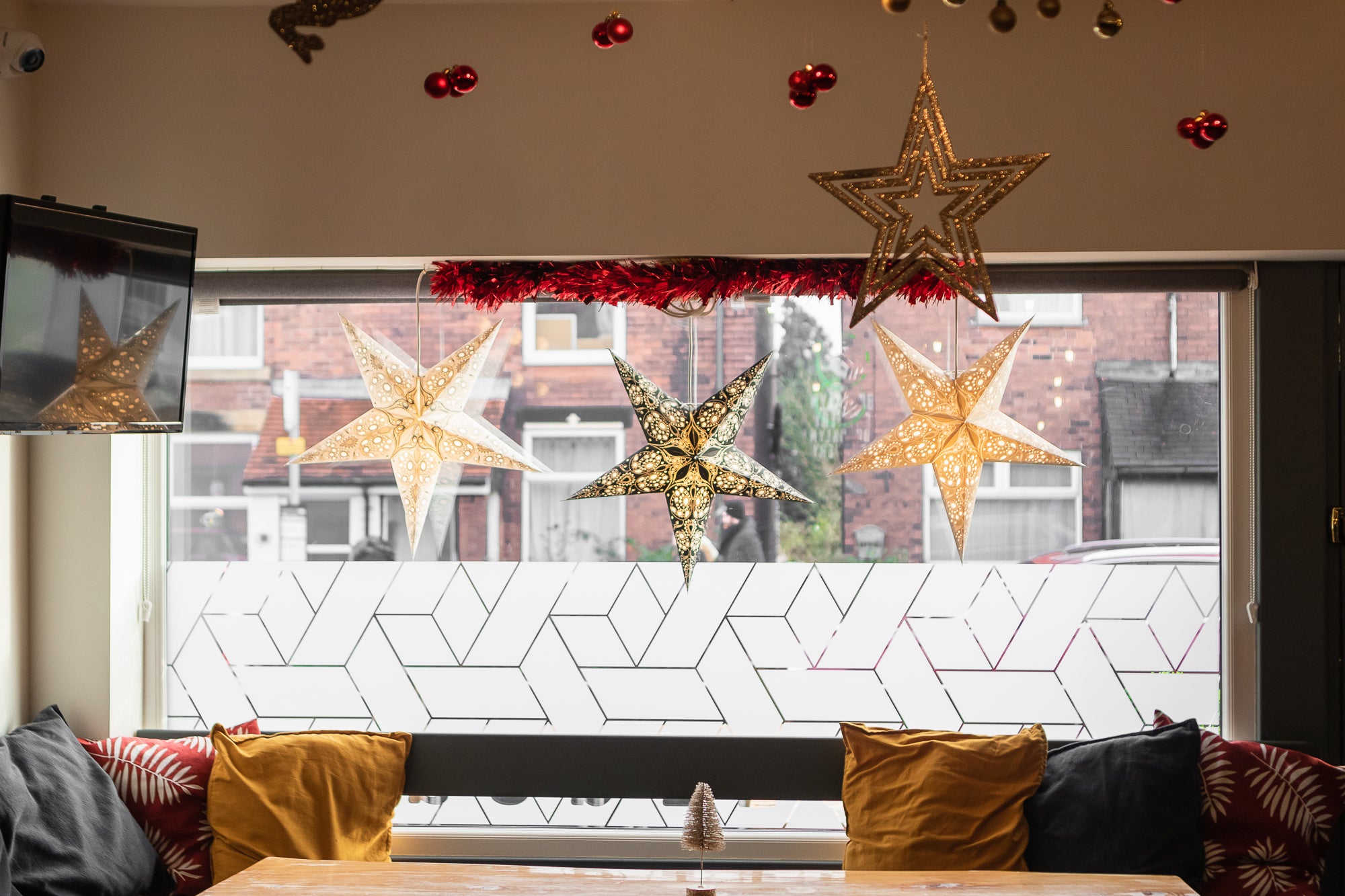 Create festive window scenes for Christmas, Diwali, Eid, and Lunar New Year. Use warm white or jewel-toned stars, layered with baubles, pine branches, or fabric for texture and depth.