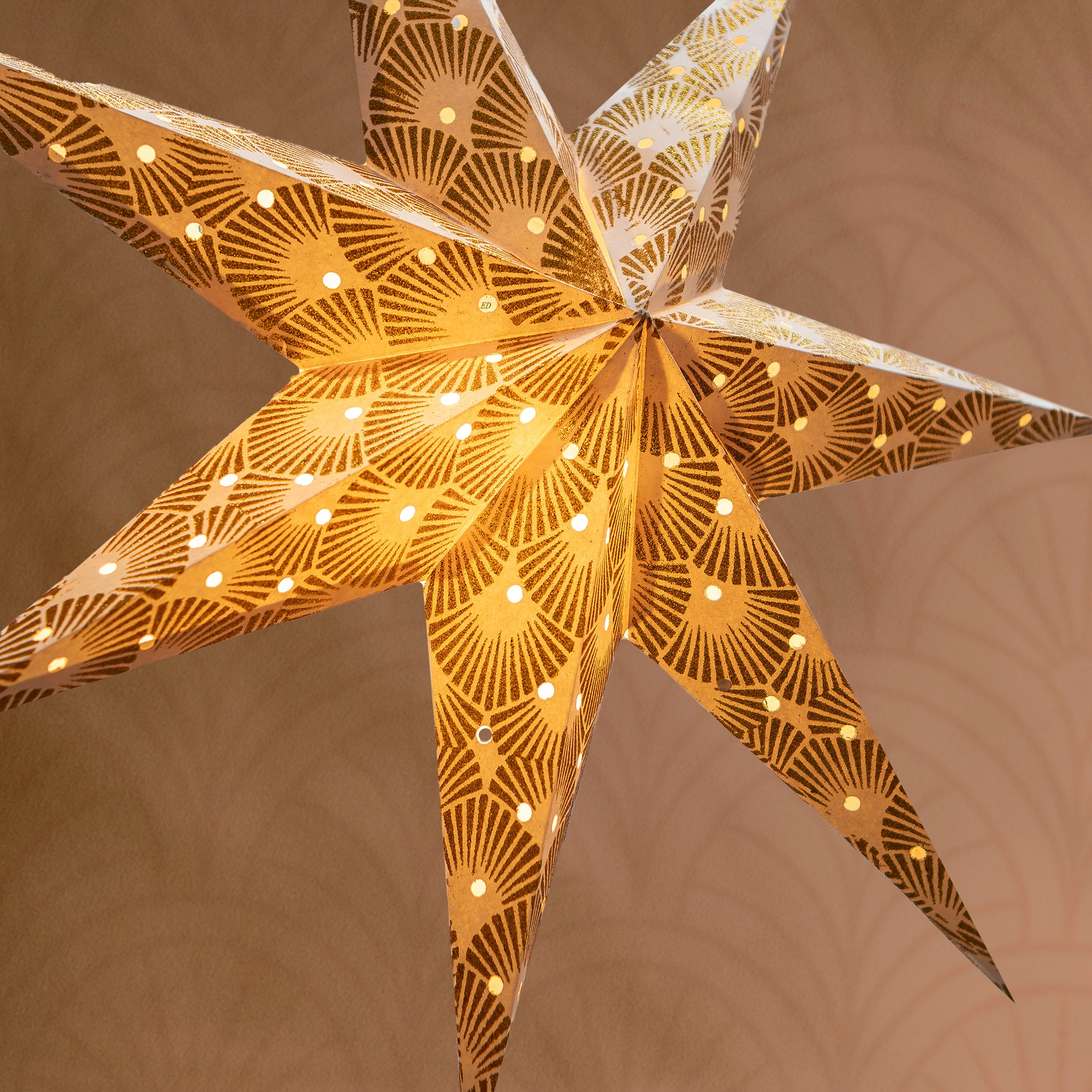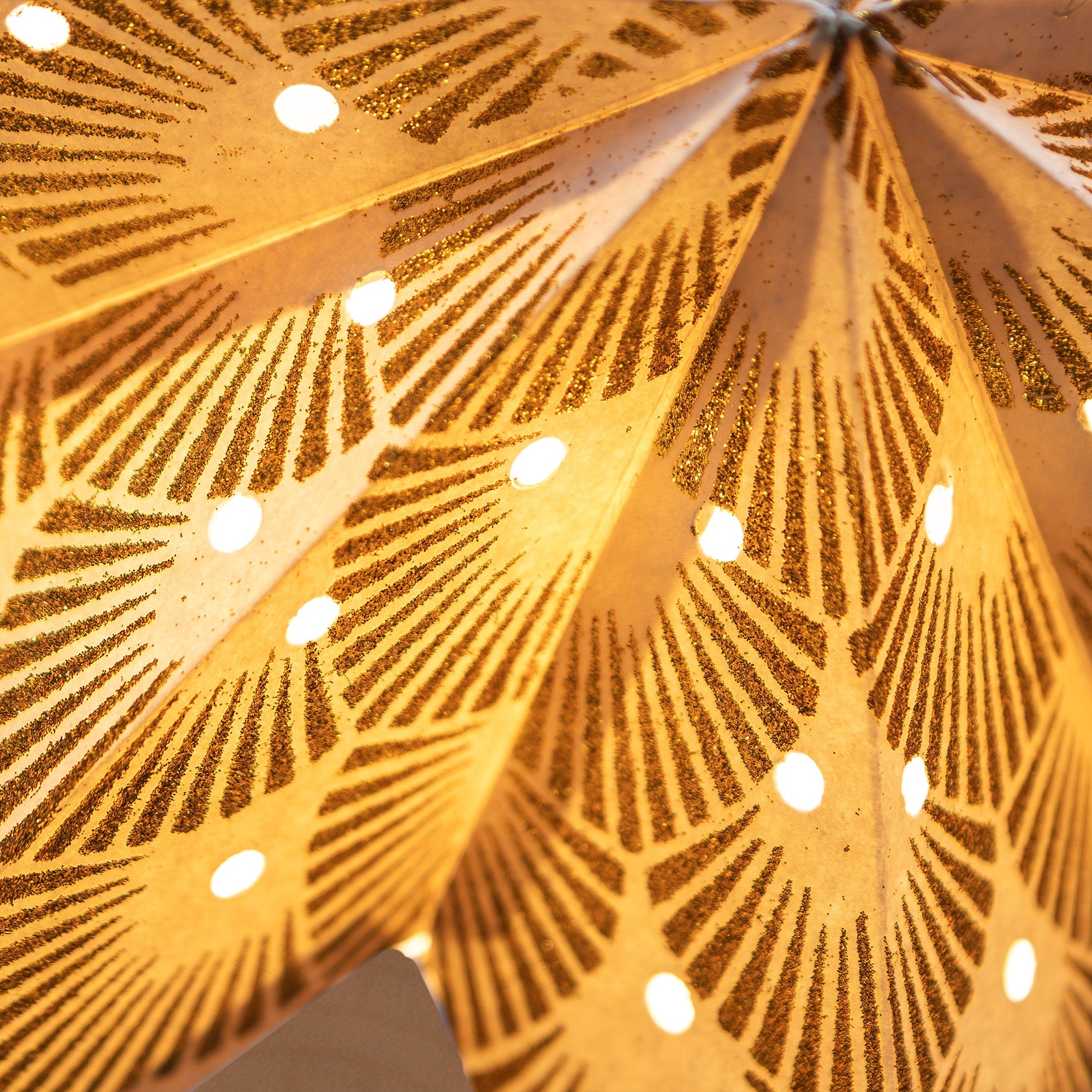 This 7-pointed star features an intricate Art Deco-inspired design finished in shimmering gold glitter. When lit, it casts a gentle, dappled glow – perfect for cosy evenings, celebratory moments, or simply bringing joy to everyday décor.