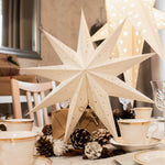 Crafted by skilled artisans in India, this 9 pointed paper star lantern is made from responsibly sourced paper and folds flat for easy storage. Its striking geometric form and bright white tone complement any décor, from festive displays to cosy everyday corners.
