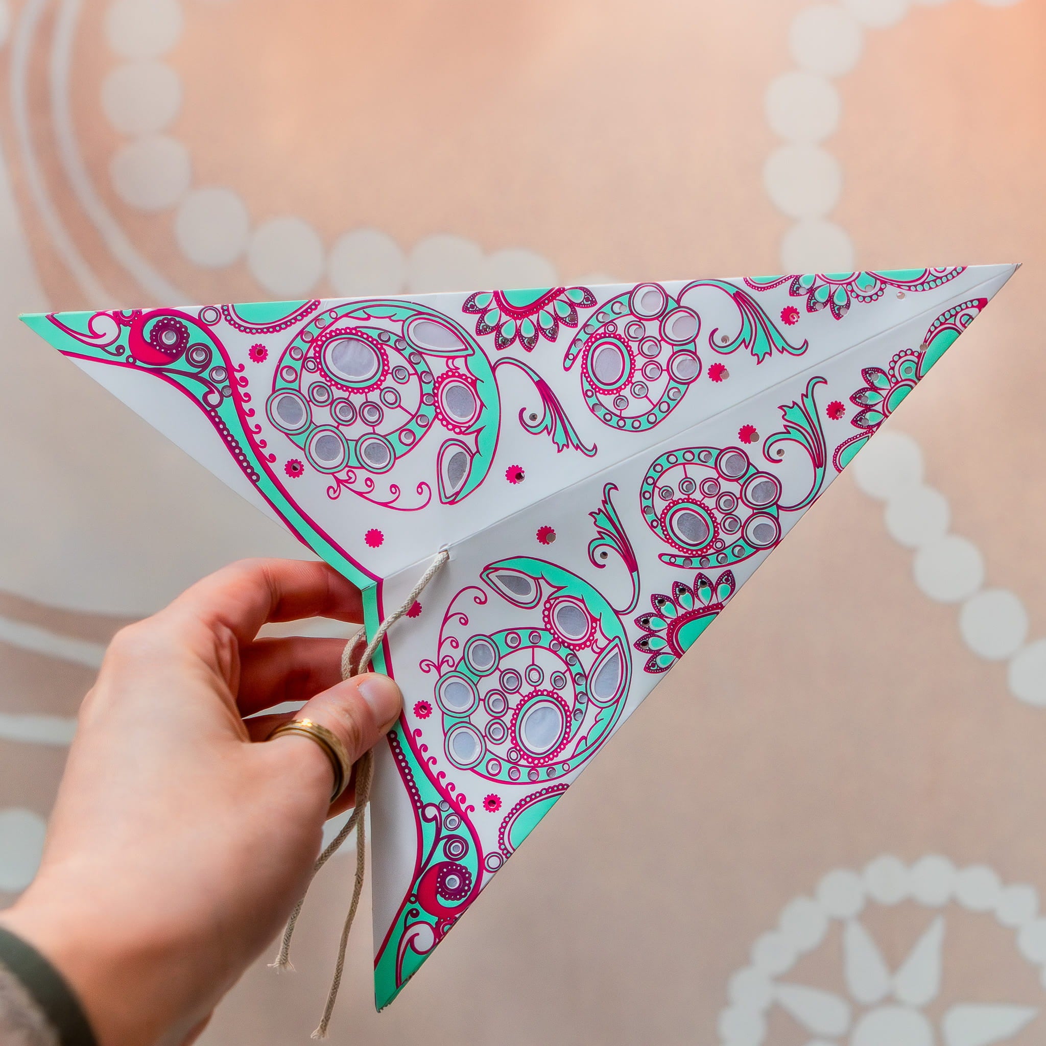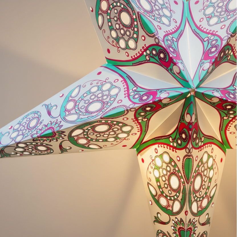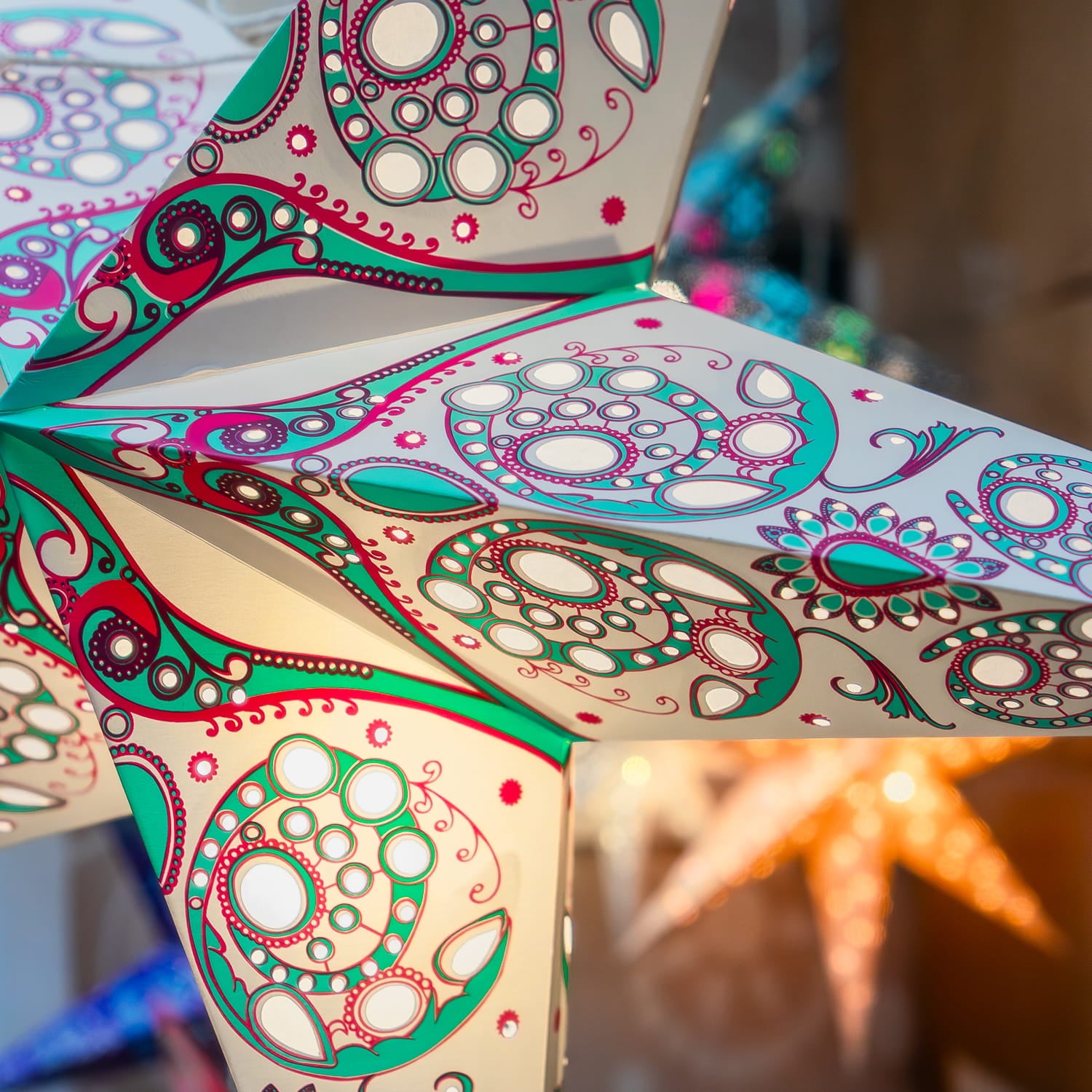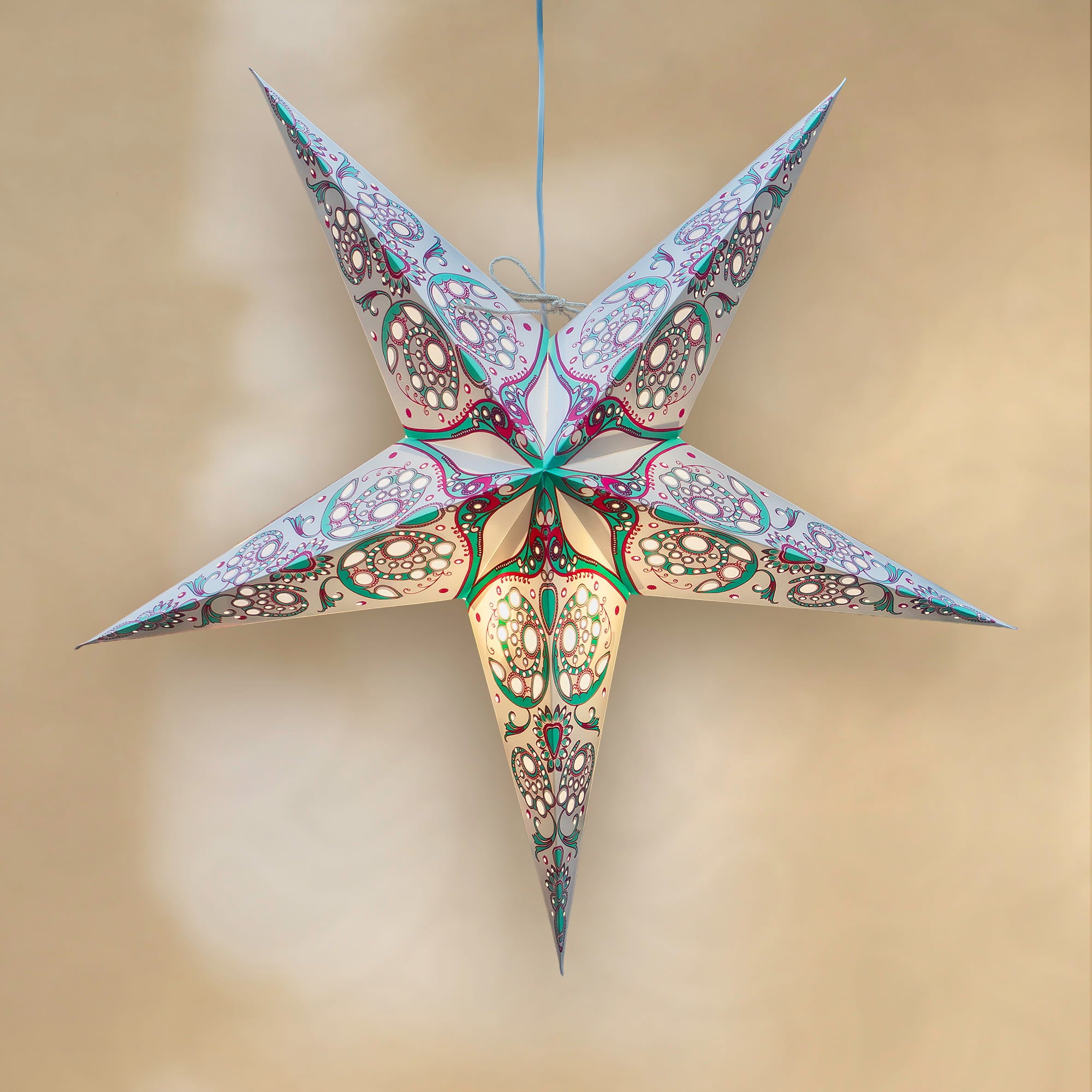 Handcrafted by skilled artisans in India, each star is finished with an elegant paisley-inspired screen print and teardrop-shaped tissue inserts that softly diffuse the light, creating a cool, serene glow.