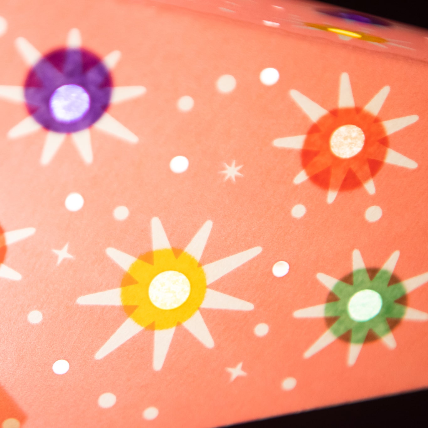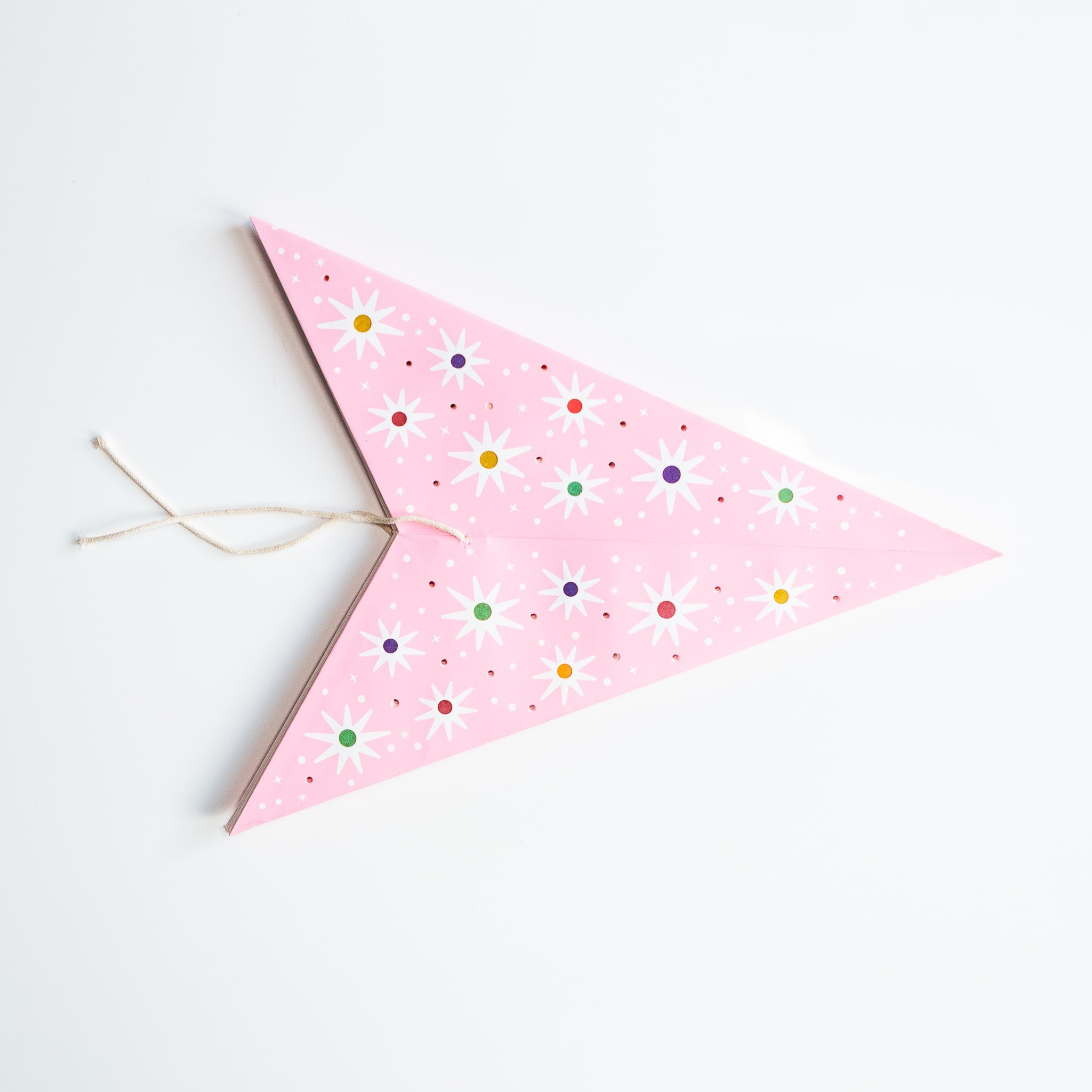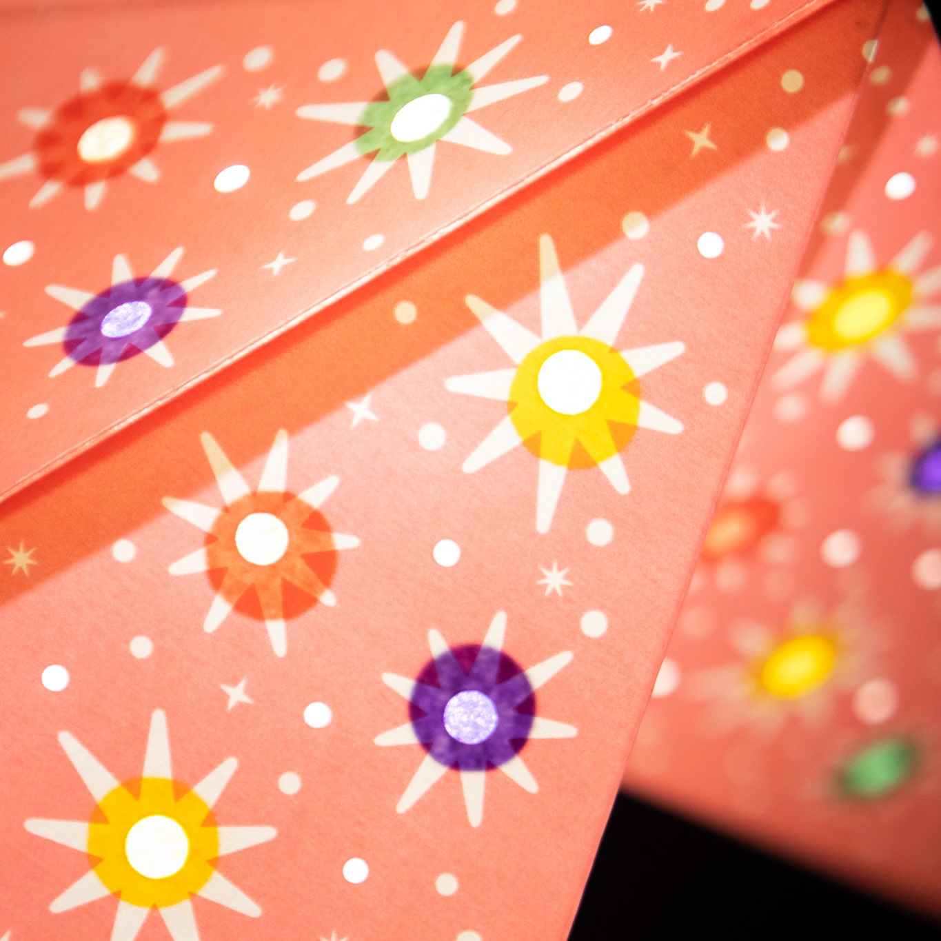 This pink lantern showcases a captivating daisy pattern with intricately designed with multi colour tissue inserts. Each lantern is carefully handcrafted with meticulous attention to detail, using responsibly sourced paper.